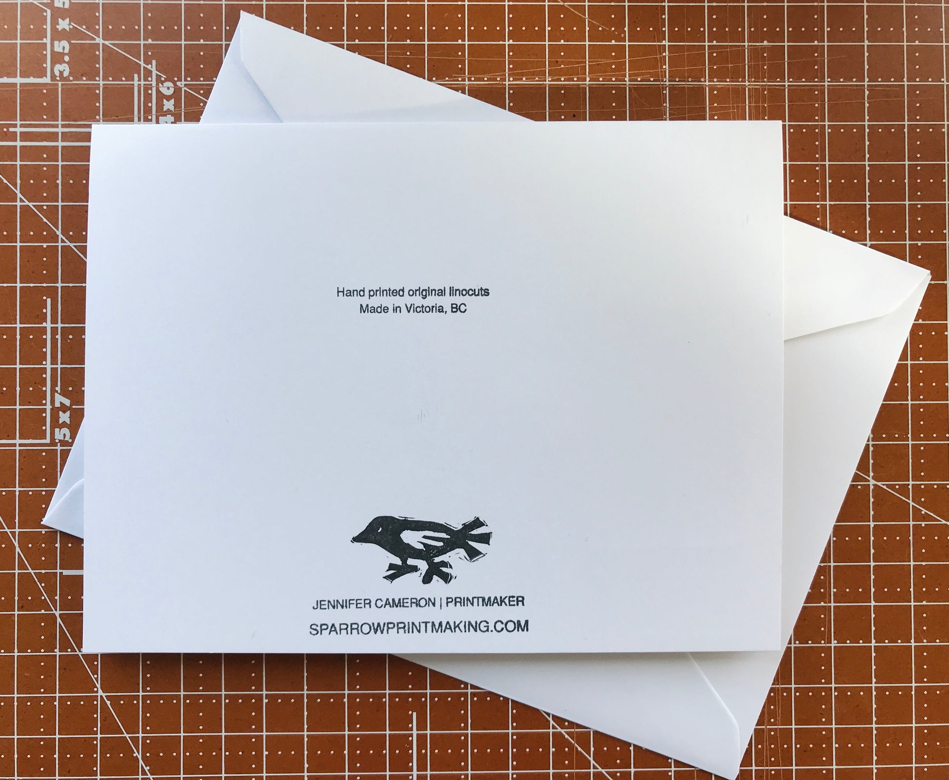 Each card is individually inked and pressed by hand, which creates slight variations in colour and texture of each card. This makes each one unique and is part of the beauty of printmaking.