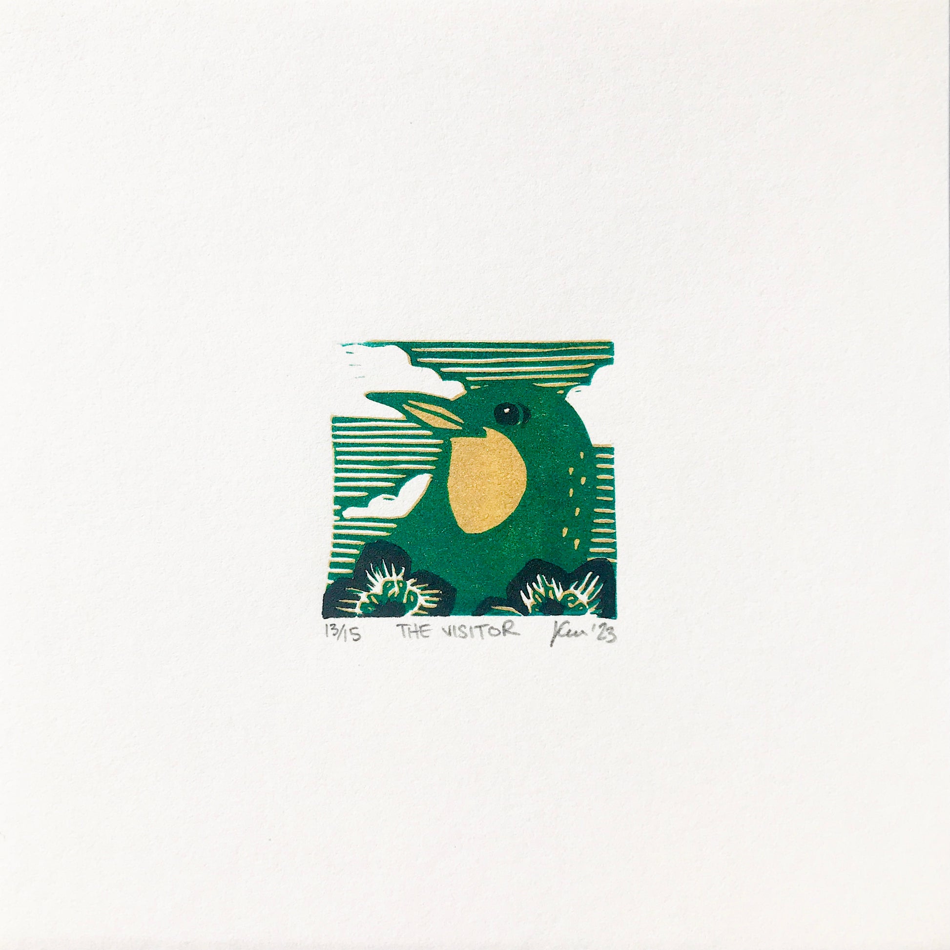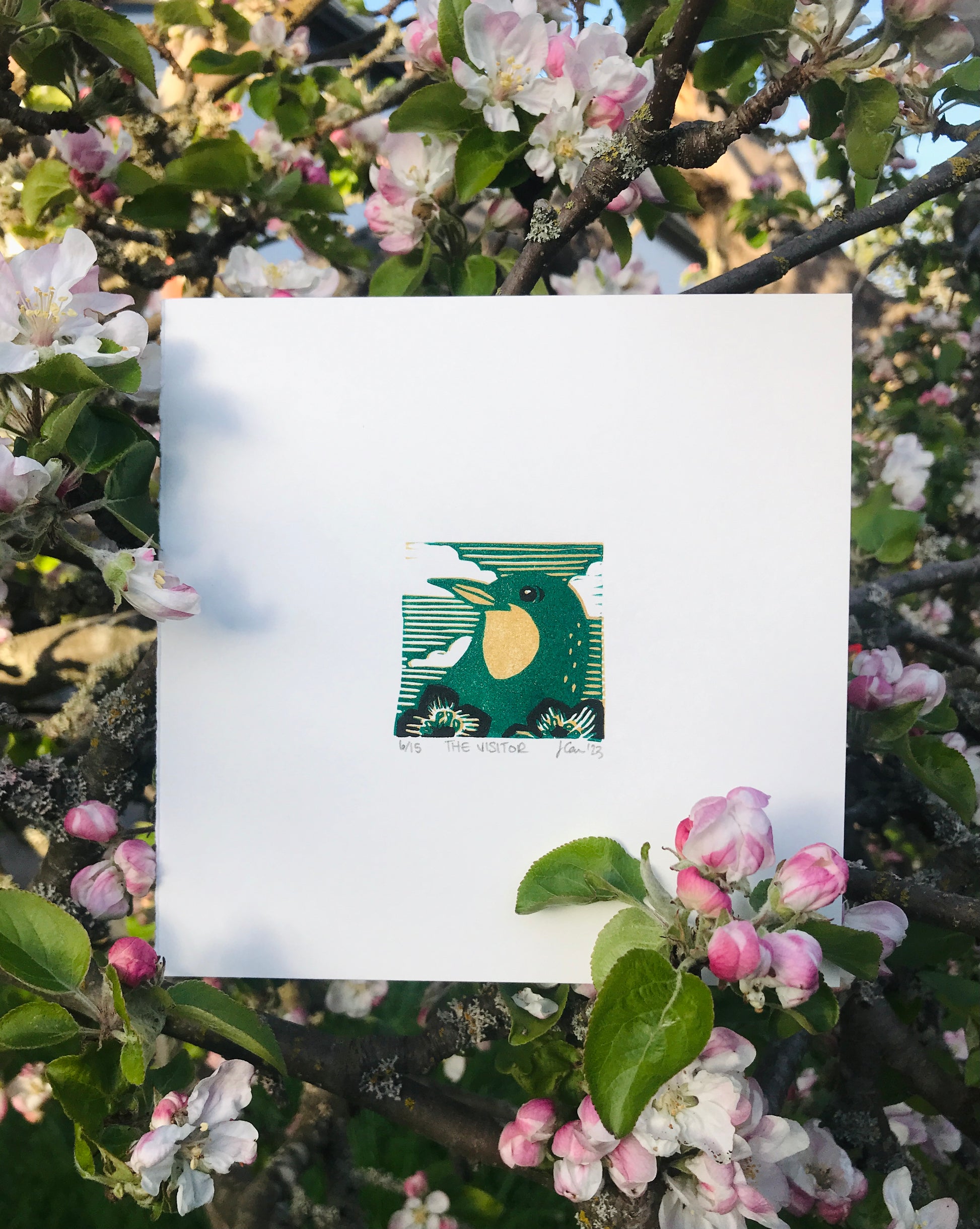 Titled "The Visitor", this original reduction lino print is inspired by a little green hummingbird (Anna's Hummingbird) that visits every day and sits at the top our apple tree.