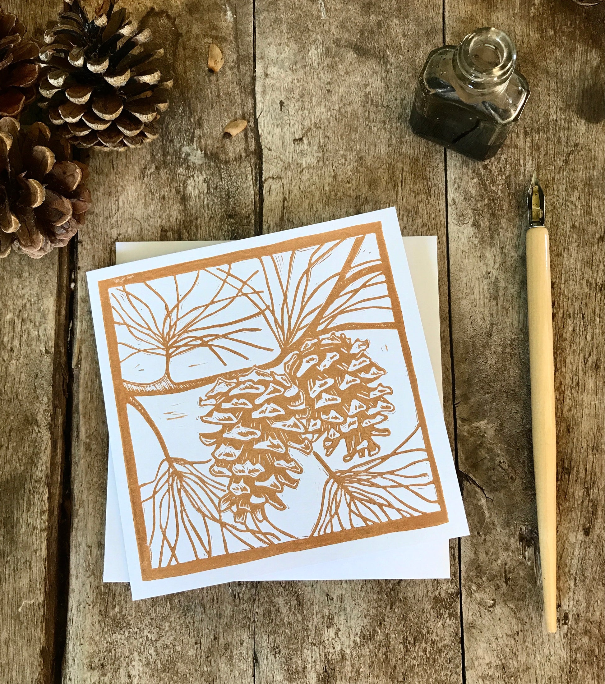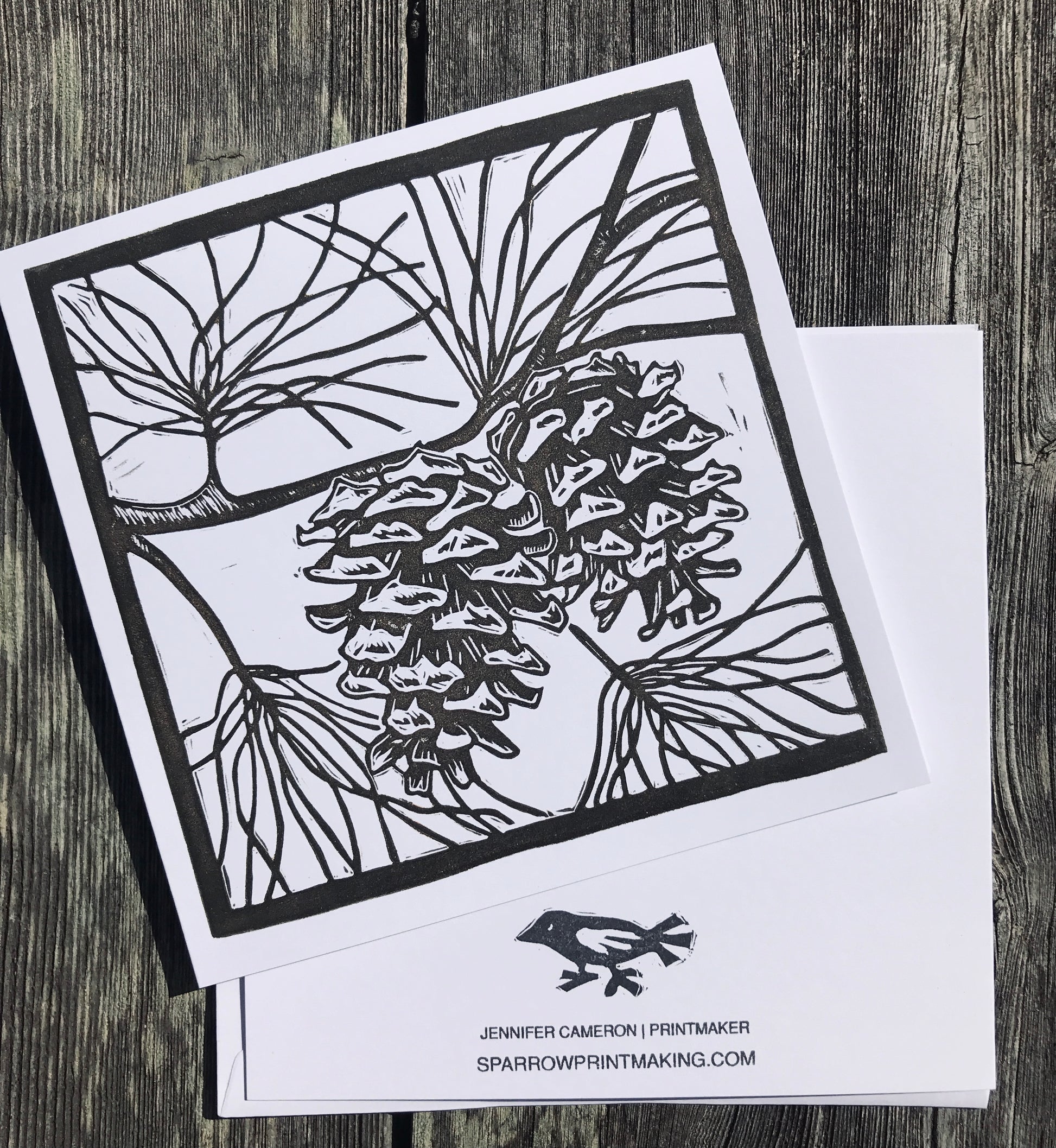 Hand carved from linoleum and hand printed using professional printmaking ink. Blank inside.