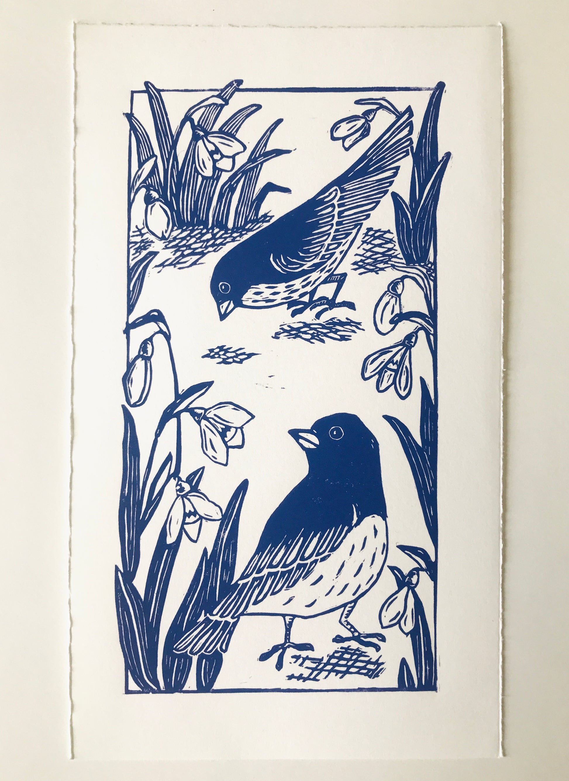 An original linocut print depicting the excitement of the first signs of Spring. Snowdrops are the first of the flowers to pop up - a sign that winter is coming to an end. Titled and signed in pencil on front.