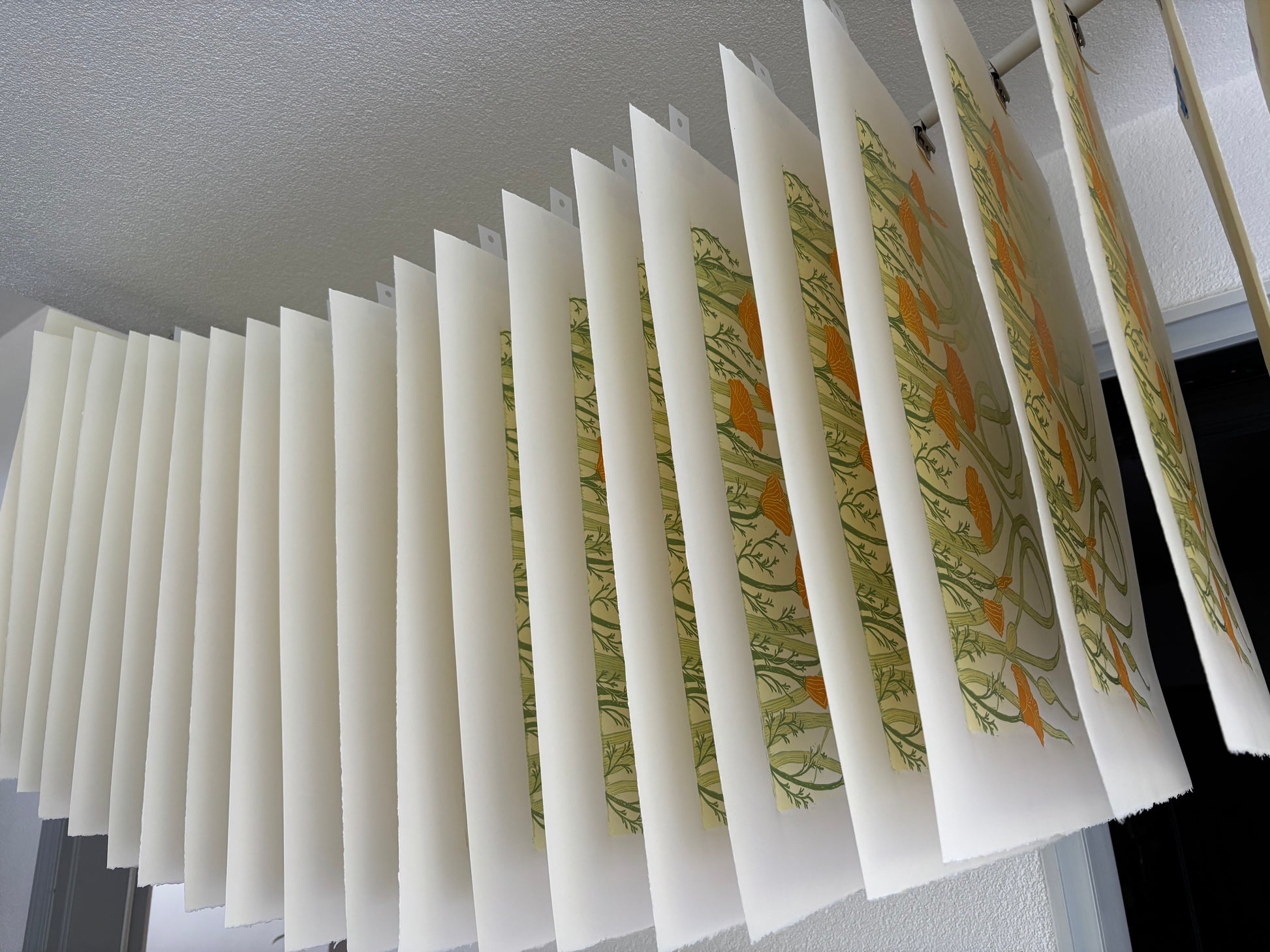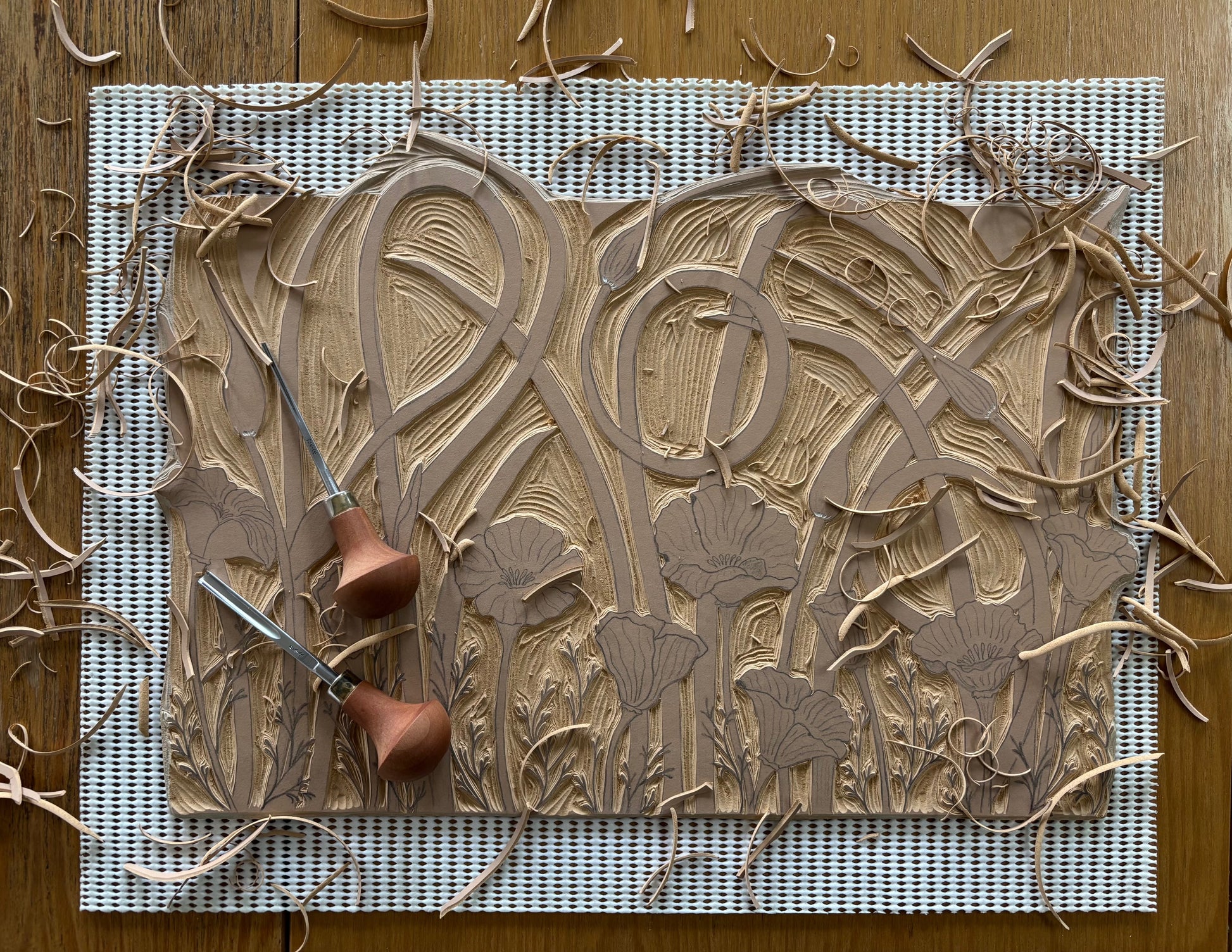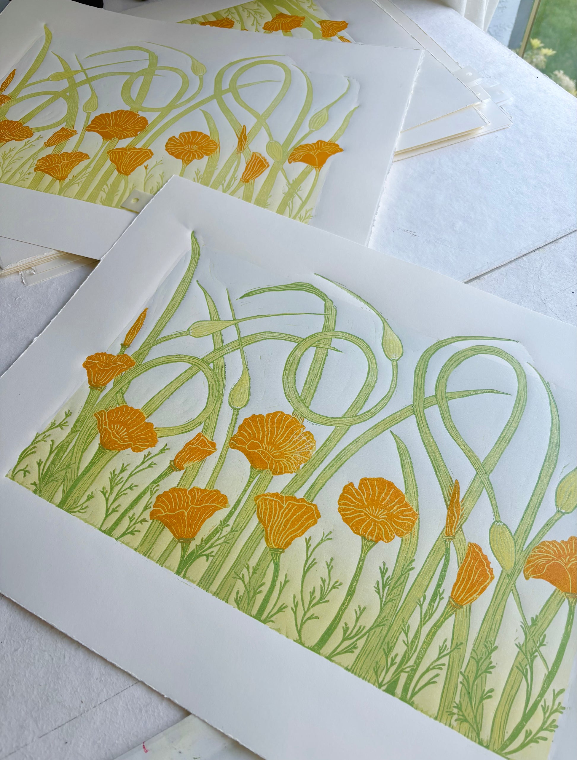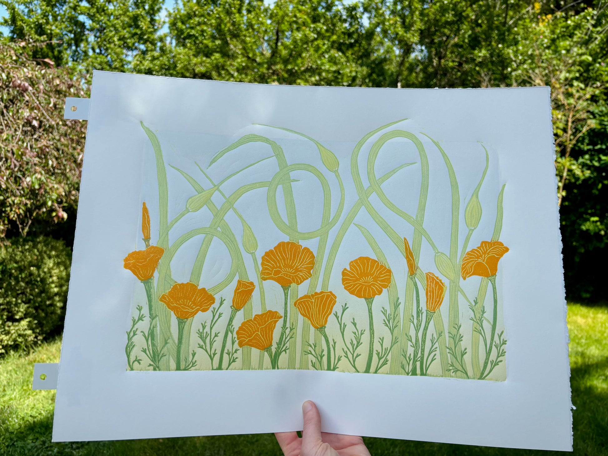 Titled "Scapes and Poppies", this original reduction lino print is inspired by the vibrant California Poppies growing throughout the garlic in my garden.