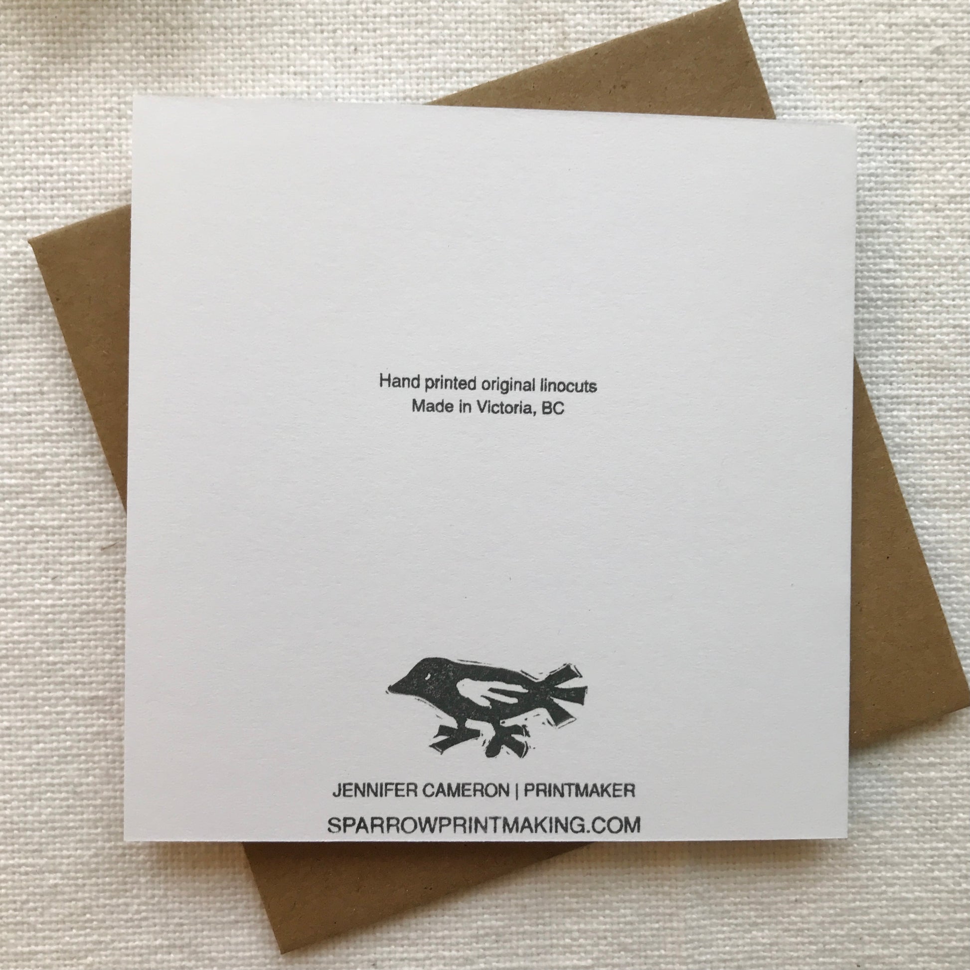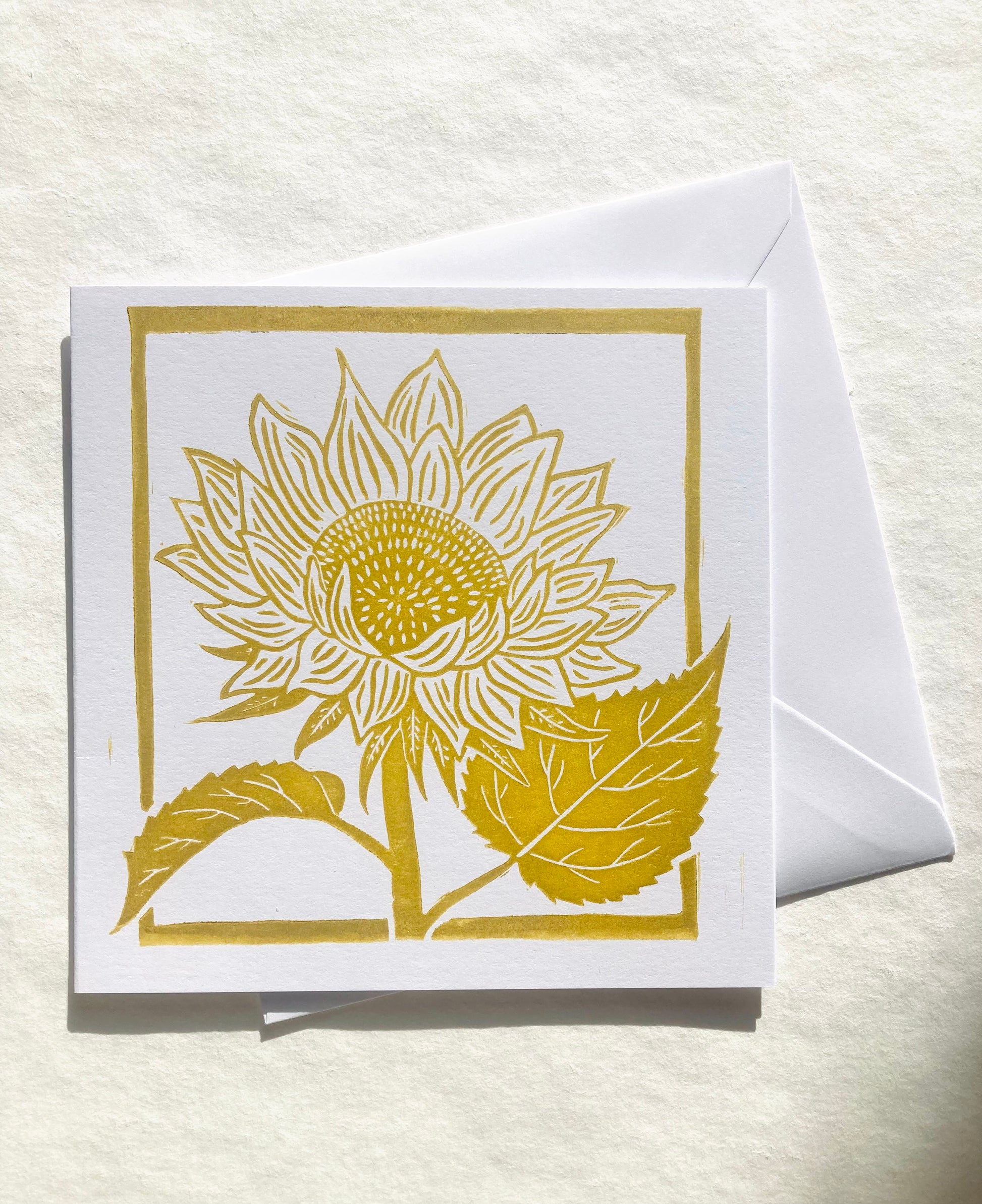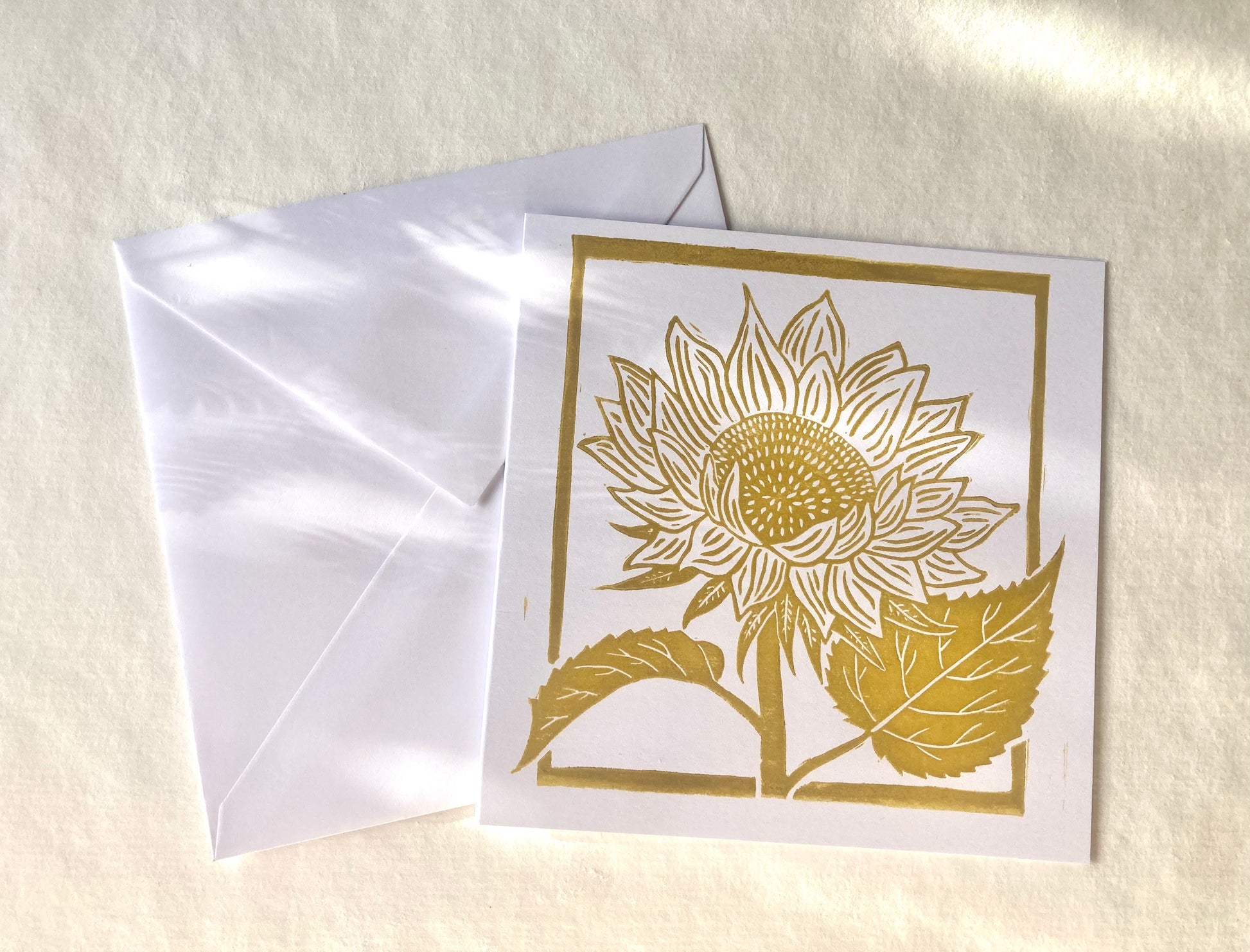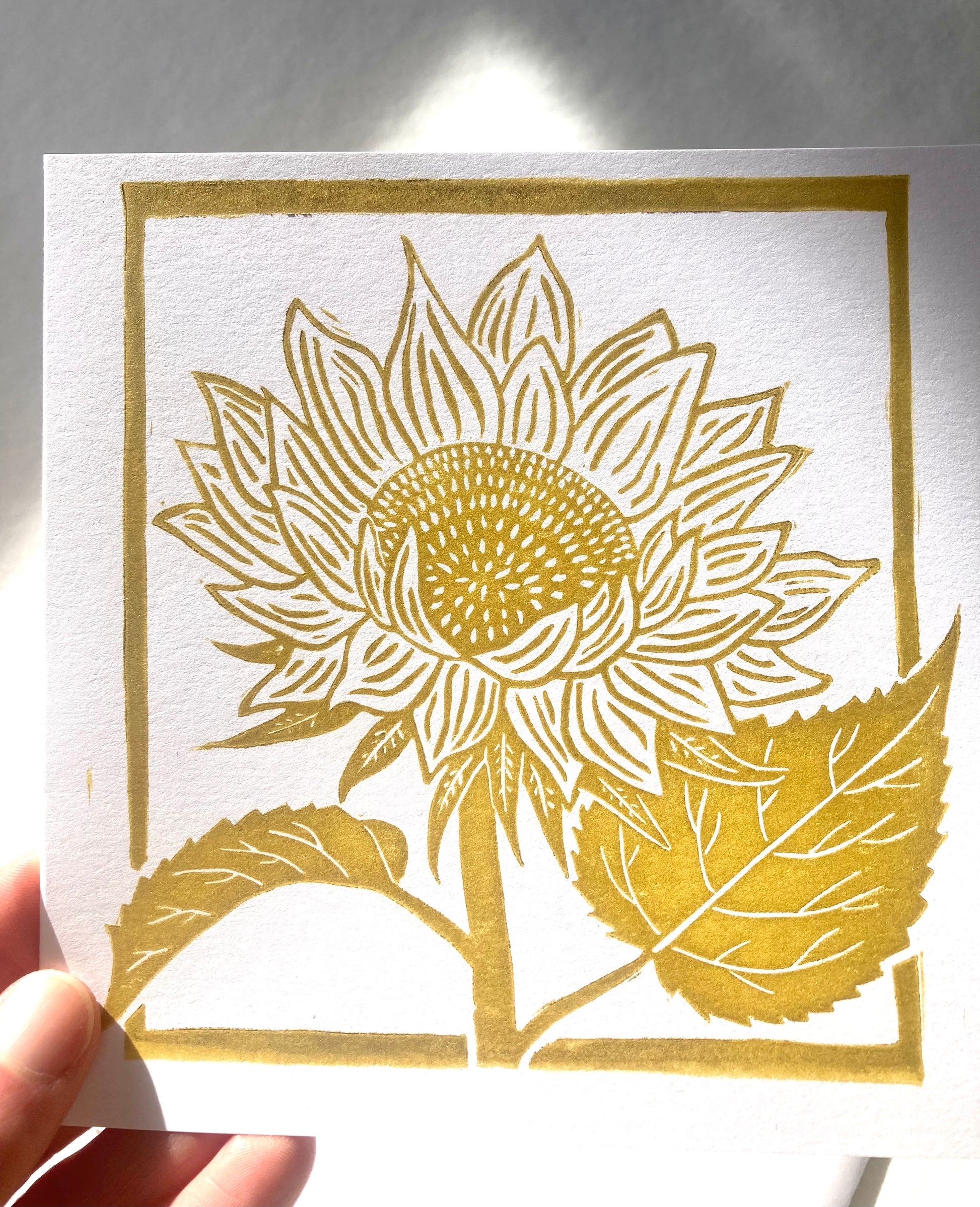 Hand carved from linoleum and hand printed in gold using professional printmaking ink. Blank inside.