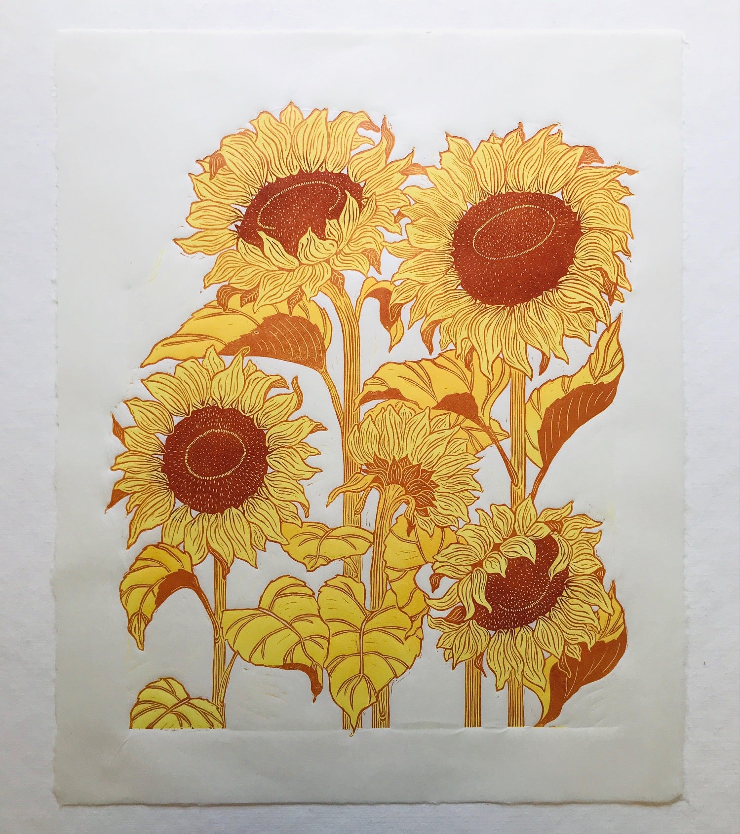 Titled "Seek the Sun", this original reduction lino print is inspired by the towering happy sunflowers that I plant in the garden each year.